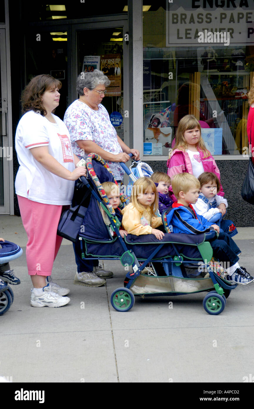 Two Female Adult Pushing 5 Children In Two Strollers Stock