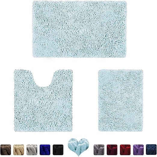 Homeideas 3 Pieces Bathroom Rugs Set Baby Blue Luxury Soft Chenille Bath Mats Set Absorbent Shaggy Bath Rugs Slip Resistant Plush Carpets Mats For