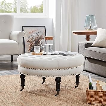 Belleze Tufted Beige Linen 33 Inch Round Accent Ottoman Foot Stool Large Beige