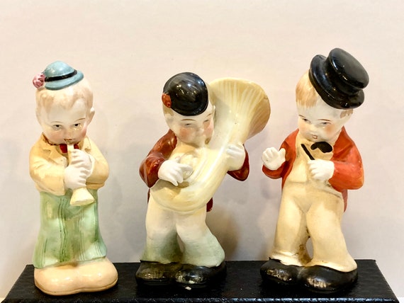 Vintage Little Boy Band 1940s Japan Ceramic Figurines Tuba Horn Hat Tailcoat Mid Century Figurine Child Playing Musical Instruments