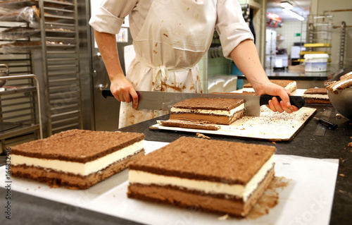 A Worker Cuts Pieces Of Chocolate Mousse Cake At Wittamer