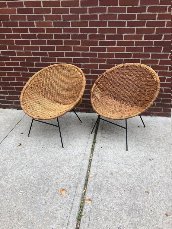 Pair Vintage Mid Century Retro Atomic Wicker Saucer