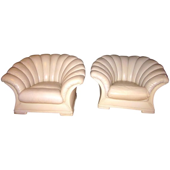 Vintage French Art Deco Channel Back Clamshell Leather Lounge Parlor Or Boudoir Cloud Chairs