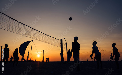 Silhouets Of Men Playing Beach Volleyball At The Evening