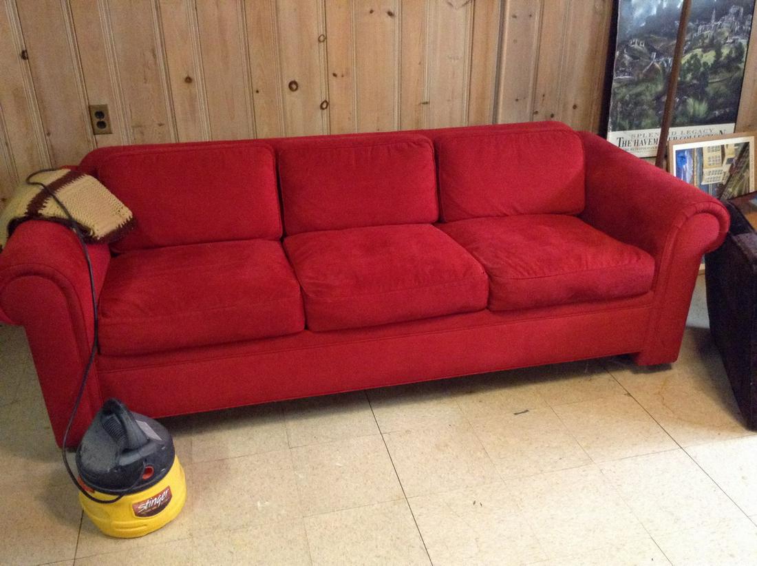 Avery Boardman Ltd Red Upholstered Sleeper Sofa Having Spring Down Cushions And Steel Weave Bed Mechanism Lg 72in