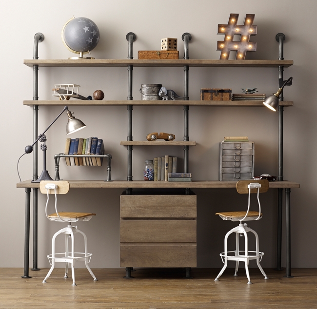 Industrial Pipe Double Desk Shelving With Drawers