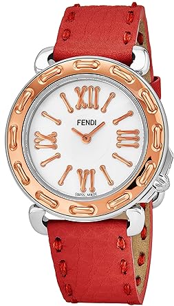Fendi Selleria Womens Stainless Steel Fashion Swiss Watch Mother Of Pearl Face Rose Gold Bezel Red Leather Strap Vintage Dress Watch For Women With
