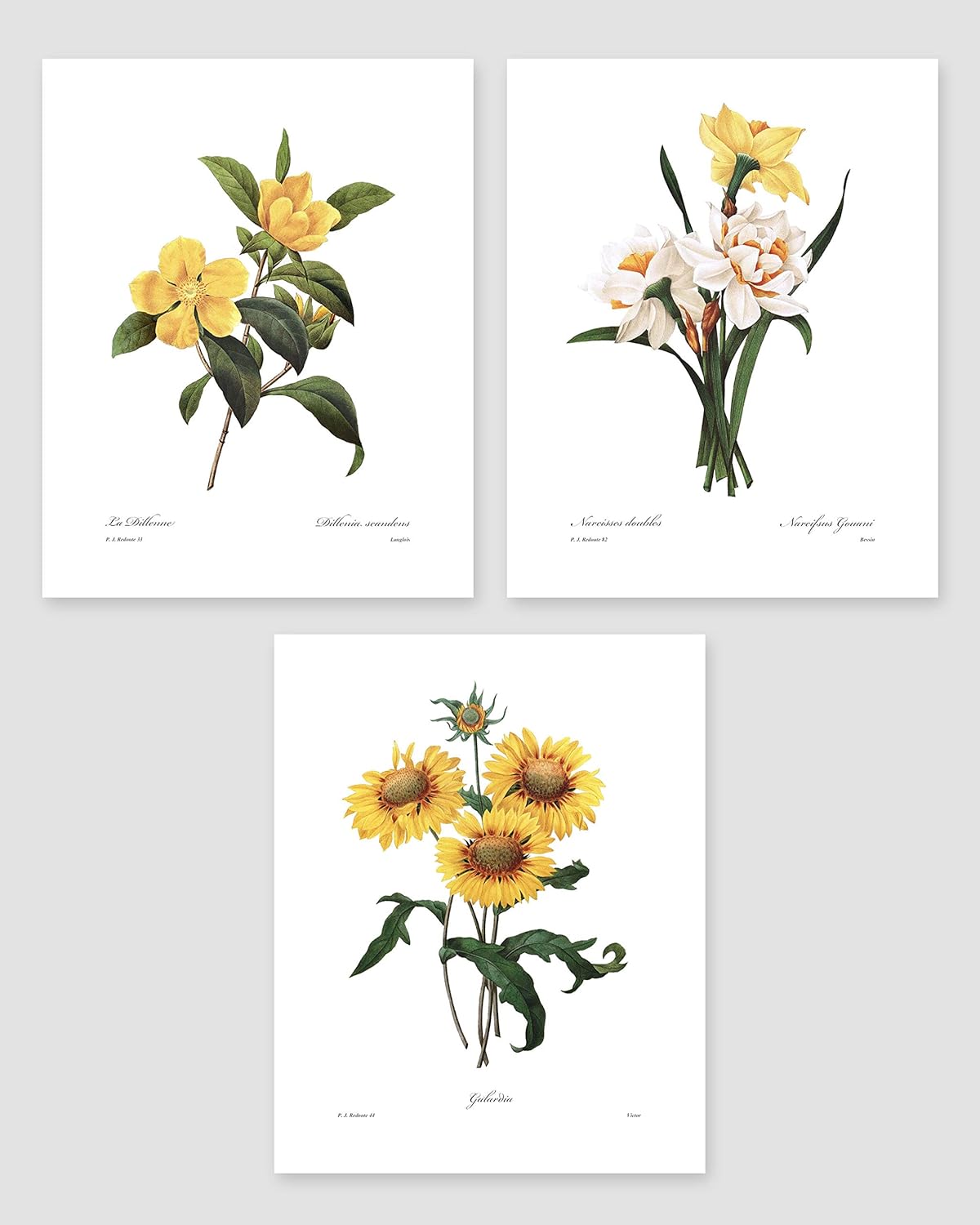 Botanical Art Yellow Flower Prints Redoute French Home Wall Decor Daffodil Sunflower Set Of 3 8x10 Unframed