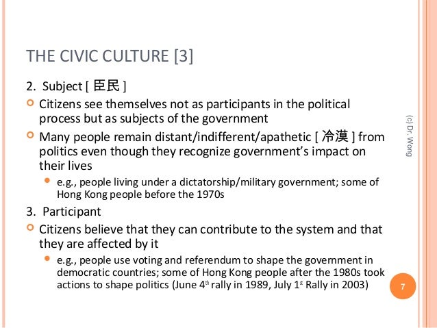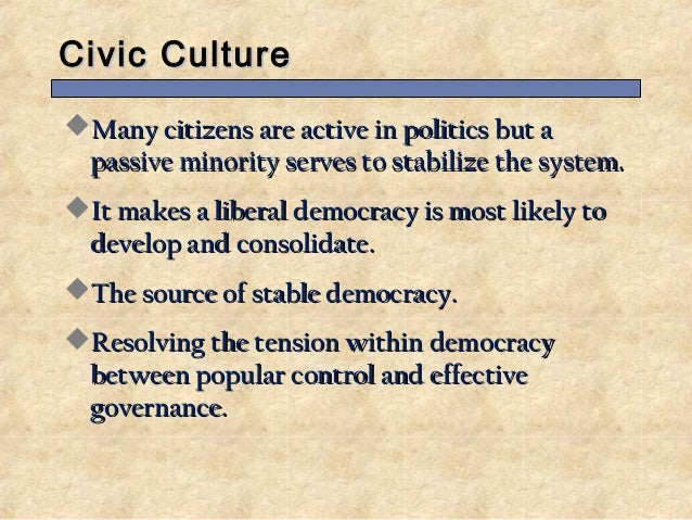 A civic culture or civic political culture is a political culture characterized by acceptance of the authority of the state and a belief in participation in civic duties. Prompted by a concern about a perceived problem of political. The book is credited with popularizing the political culture sub field and is considered to be the first systematic study in this field.