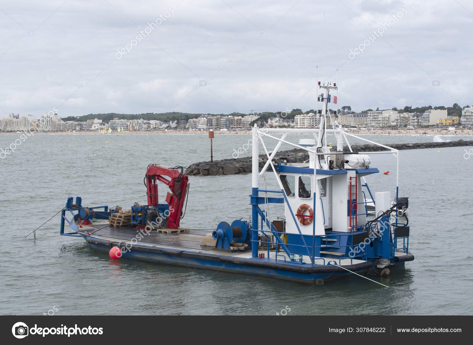 Platform Boat Crane Moored Vicinity Breton Coast Stock