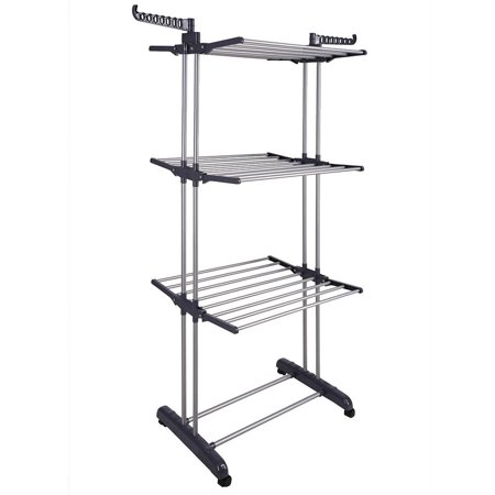 Ghp Black 3 Tier 6 Foldable Shelves Rolling Clothes Drying Rack With 2 Side Wings