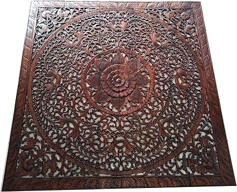 Wood Carved Wall Art Large Carved Wood Panel Thai Decorative Wood Panel Wood Wall Sculpture Asian Bali Home Decor Lotus Flower Wall Decor Dark