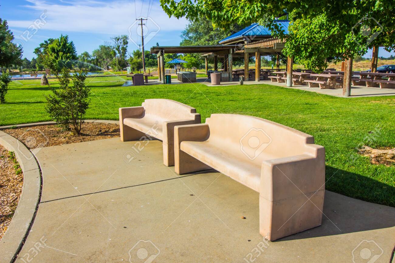 Concrete Benches In A Rest Area On The Highway Stock Photo