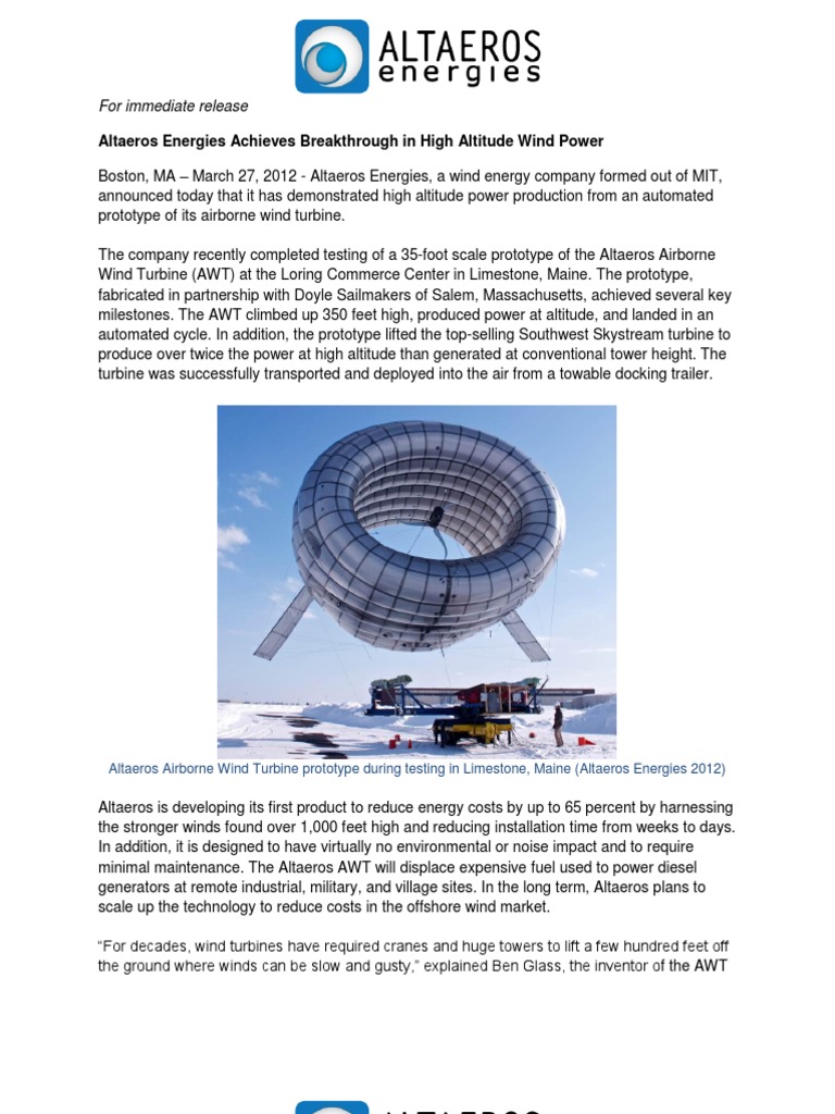 Altaeros Press Release032712 Energie Eolienne Eolienne